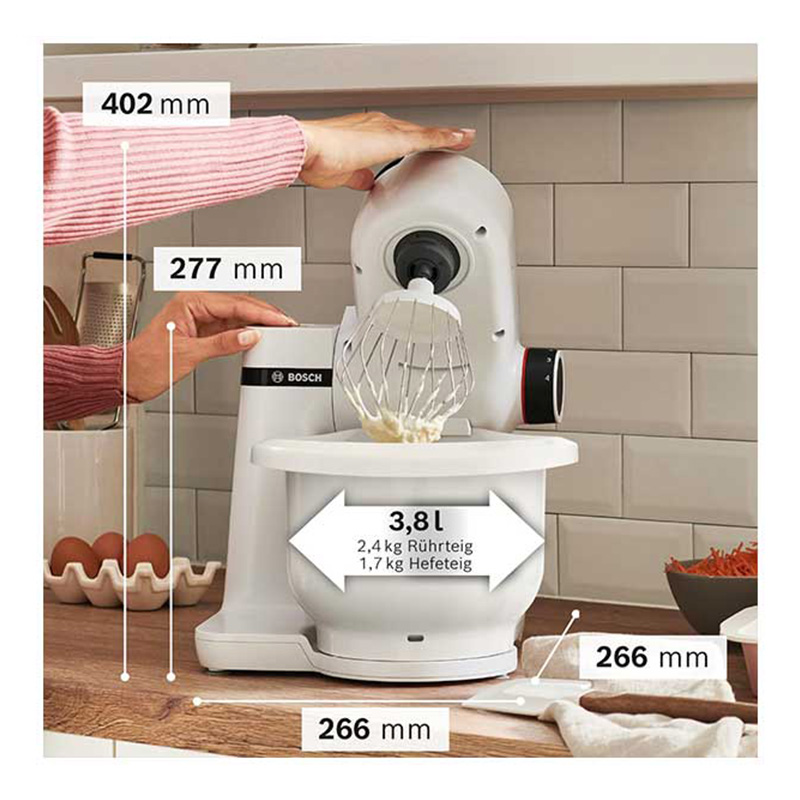 | ظرفیت کاسه | 3.8 لیتر - برای حداکثر 2.4 کیلوگرم مخلوط مواد کیک یا 1.7 کیلوگرم آرد به اضافه ترکیبات دارای مایه خمیر مناسب است |